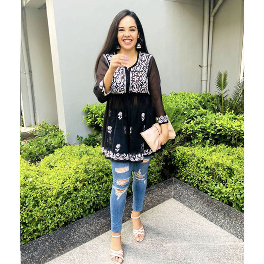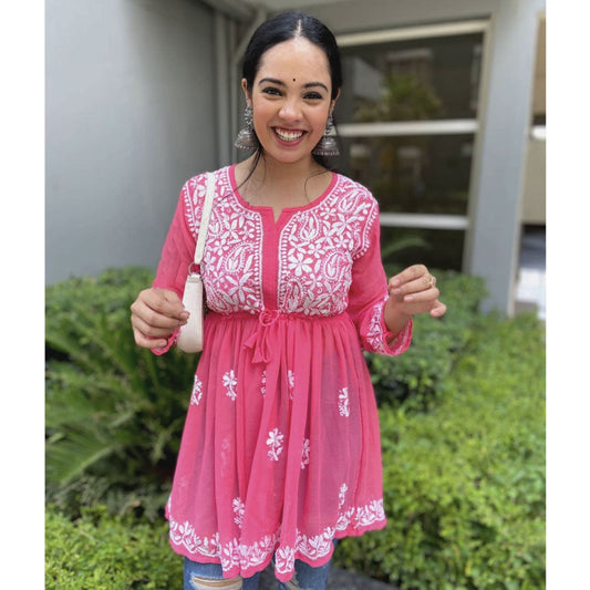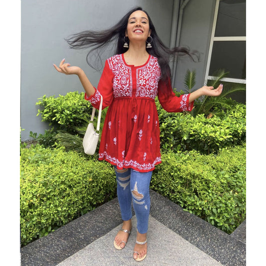 Leaf Embroidered Half Buttoned Cotton Tunic